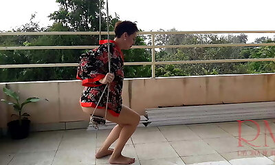 Cute housewife has joy without undies on the swing Slut swings and shows her perfect pussy 1